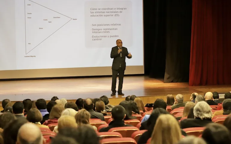 «La arquitectura de los sistemas de Educación Superior, está compuesta por la gobernanza actual, que se grafica en quiénes y cómo conducen el país. Adicionalmente, se compone de un importante campo organizacional, que se materializa en el espacio reglado en que se desenvuelven las instituciones; y por una economía política de quiénes proveen la Educación Superior, y de cómo se paga. Cada uno de estos elementos se relacionan entre sí, y poseen de manera independiente su propia trayectoria e historia», sentenció.