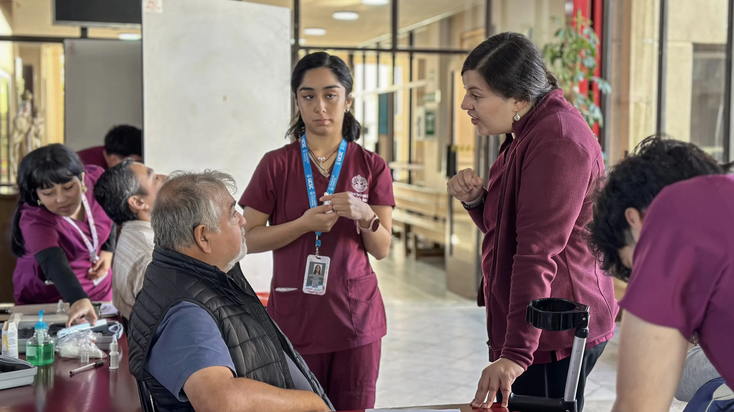 Los estudiantes de la carrera Tecnología Médica, mención en Oftalmología y Optometría, realizaron exámenes de presión ocular, bajo la supervisión de académicas especializadas, Carmen Gloria García, Yessica Ramírez, Claudia Sepúlveda y Paulina Araya, donde desempeñaron un papel crucial en la organización y realización de las actividades preventivas, reforzando así su formación académica y su compromiso con la salud pública.